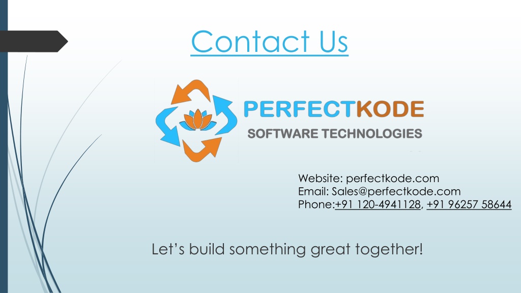 Contact Us Website: perfectkode.com Email: Sales@perfectkode.com Phone:+91 120-4941128, +91 96257 58644 Let’s build something great together!