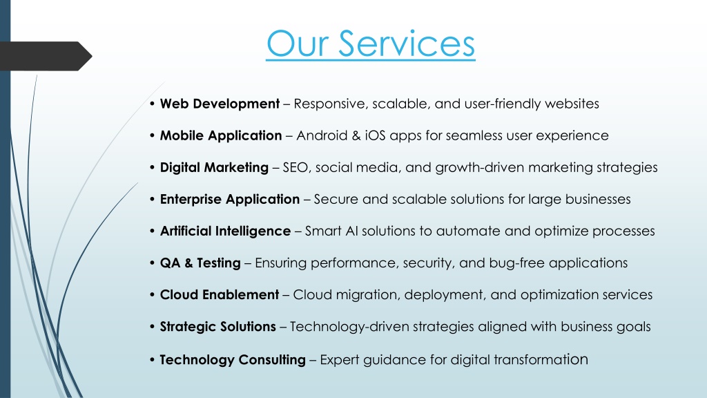 Our Services • Web Development – Responsive, scalable, and user-friendly websites • Mobile Application – Android & iOS apps for seamless user experience • Digital Marketing – SEO, social media, and growth-driven marketing strategies • Enterprise Application – Secure and scalable solutions for large businesses • Artificial Intelligence – Smart AI solutions to automate and optimize processes • QA & Testing – Ensuring performance, security, and bug-free applications • Cloud Enablement – Cloud migration, deployment, and optimization services • Strategic Solutions – Technology-driven strategies aligned with business goals • Technology Consulting – Expert guidance for digital transformation