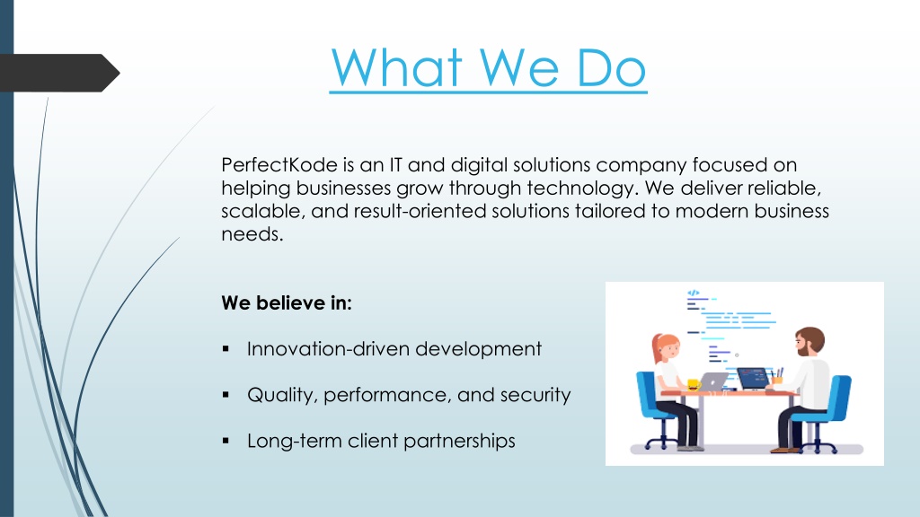 What We Do • PerfectKode is an IT and digital solutions company focused on helping businesses grow through technology. We deliver reliable, scalable, and result-oriented solutions tailored to modern business needs. • We believe in: • Innovation-driven development • Quality, performance, and security • Long-term client partnerships