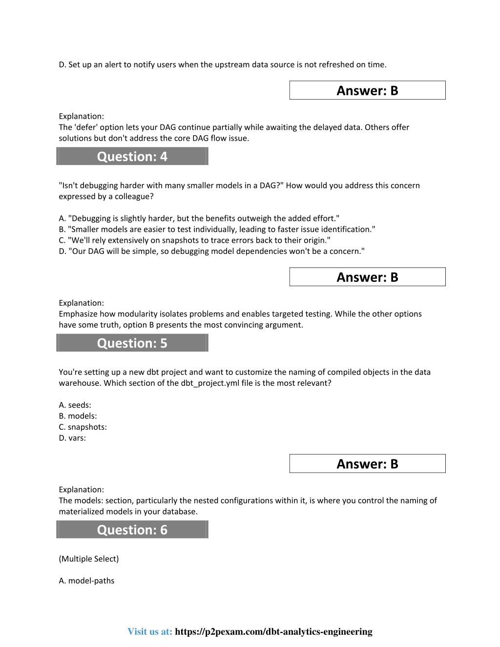 D.Set up an alert to notify users when the upstream data source is not refreshed on time. Answer: B Explanation: The 'defer' option lets your DAG continue partially while awaiting the delayed data. Others offer solutions but don't address the core DAG flow issue. Question: 4 "Isn't debugging harder with many smaller models in a DAG?" How would you address this concern expressed by a colleague? A."Debugging is slightly harder, but the benefits outweigh the added effort." B."Smaller models are easier to test individually, leading to faster issue identification." C."We'll rely extensively on snapshots to trace errors back to their origin." D."Our DAG will be simple, so debugging model dependencies won't be a concern." Answer: B Explanation: Emphasize how modularity isolates problems and enables targeted testing. While the other options have some truth, option B presents the most convincing argument. Question: 5 You're setting up a new dbt project and want to customize the naming of compiled objects in the data warehouse. Which section of the dbt_project.yml file is the most relevant? A.seeds: B.models: C.snapshots: D.vars: Answer: B Explanation: The models: section, particularly the nested configurations within it, is where you control the naming of materialized models in your database. Question: 6 (Multiple Select) A.model-paths Visit us at: https://p2pexam.com/dbt-analytics-engineering