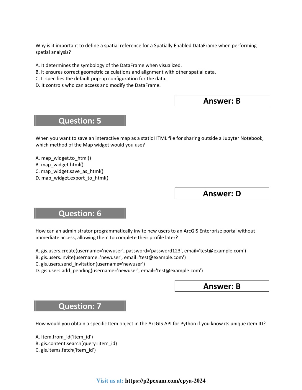 Why is it important to define a spatial reference for a Spatially Enabled DataFrame when performing spatial analysis? A.It determines the symbology of the DataFrame when visualized. B.It ensures correct geometric calculations and alignment with other spatial data. C.It specifies the default pop-up configuration for the data. D.It controls who can access and modify the DataFrame. Answer: B Question: 5 When you want to save an interactive map as a static HTML file for sharing outside a Jupyter Notebook, which method of the Map widget would you use? A.map_widget.to_html() B.map_widget.html() C.map_widget.save_as_html() D.map_widget.export_to_html() Answer: D Question: 6 How can an administrator programmatically invite new users to an ArcGIS Enterprise portal without immediate access, allowing them to complete their profile later? A.gis.users.create(username='newuser', password='password123', email='test@example.com') B.gis.users.invite(username='newuser', email='test@example.com') C.gis.users.send_invitation(username='newuser') D.gis.users.add_pending(username='newuser', email='test@example.com') Answer: B Question: 7 How would you obtain a specific Item object in the ArcGIS API for Python if you know its unique item ID? A.Item.from_id('item_id') B.gis.content.search(query=item_id) C.gis.items.fetch('item_id') Visit us at: https://p2pexam.com/epya-2024
