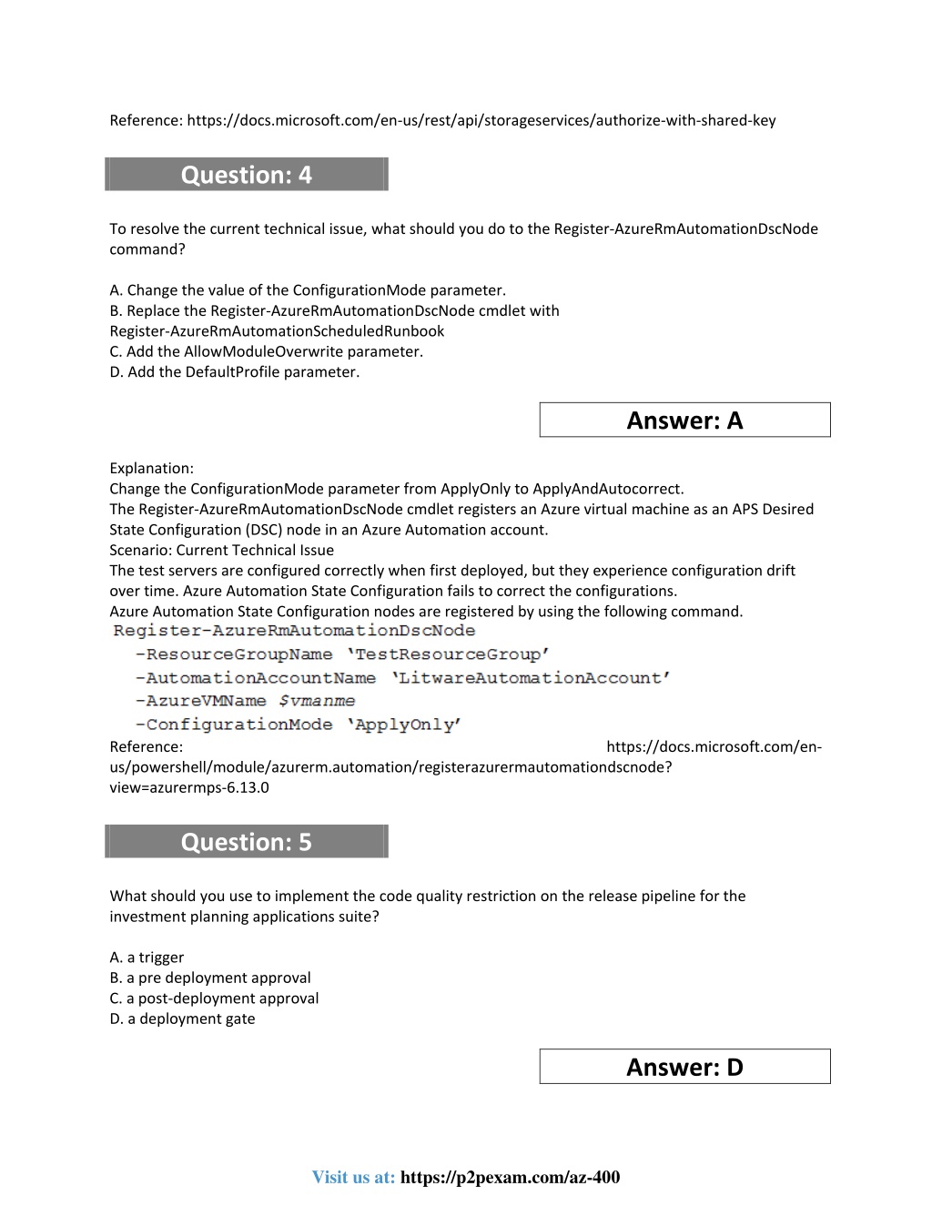 Reference: https://docs.microsoft.com/en-us/rest/api/storageservices/authorize-with-shared-key Question: 4 To resolve the current technical issue, what should you do to the Register-AzureRmAutomationDscNode command? A. Change the value of the ConfigurationMode parameter. B. Replace the Register-AzureRmAutomationDscNode cmdlet with Register-AzureRmAutomationScheduledRunbook C. Add the AllowModuleOverwrite parameter. D. Add the DefaultProfile parameter. Answer: A Explanation: Change the ConfigurationMode parameter from ApplyOnly to ApplyAndAutocorrect. The Register-AzureRmAutomationDscNode cmdlet registers an Azure virtual machine as an APS Desired State Configuration (DSC) node in an Azure Automation account. Scenario: Current Technical Issue The test servers are configured correctly when first deployed, but they experience configuration drift over time. Azure Automation State Configuration fails to correct the configurations. Azure Automation State Configuration nodes are registered by using the following command. Reference: us/powershell/module/azurerm.automation/registerazurermautomationdscnode? view=azurermps-6.13.0 Question: 5 https://docs.microsoft.com/en- What should you use to implement the code quality restriction on the release pipeline for the investment planning applications suite? A. a trigger B. a pre deployment approval C. a post-deployment approval D. a deployment gate Answer: D Visit us at: https://p2pexam.com/az-400
