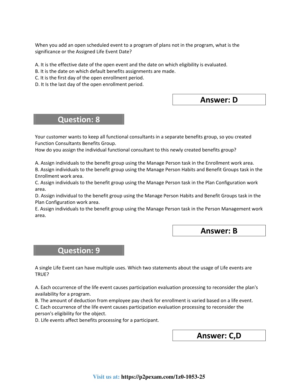 When you add an open scheduled event to a program of plans not in the program, what is the significance or the Assigned Life Event Date? A.It is the effective date of the open event and the date on which eligibility is evaluated. B.It is the date on which default benefits assignments are made. C.It is the first day of the open enrollment period. D.It Is the last day of the open enrollment period. Answer: D Question: 8 Your customer wants to keep all functional consultants in a separate benefits group, so you created Function Consultants Benefits Group. How do you assign the individual functional consultant to this newly created benefits group? A.Assign individuals to the benefit group using the Manage Person task in the Enrollment work area. B.Assign individuals to the benefit group using the Manage Person Habits and Benefit Groups task in the Enrollment work area. C.Assign individuals to the benefit group using the Manage Person task in the Plan Configuration work area. D.Assign individual to the benefit group using the Manage Person Habits and Benefit Groups task in the Plan Configuration work area. E.Assign individuals to the benefit group using the Manage Person task in the Person Management work area. Answer: B Question: 9 A single Life Event can have multiple uses. Which two statements about the usage of Life events are TRUE? A.Each occurrence of the life event causes participation evaluation processing to reconsider the plan's availability for a program. B.The amount of deduction from employee pay check for enrollment is varied based on a life event. C.Each occurrence of the life event causes participation evaluation processing to reconsider the person's eligibility for the object. D.Life events affect benefits processing for a participant. Answer: C,D Visit us at: https://p2pexam.com/1z0-1053-25