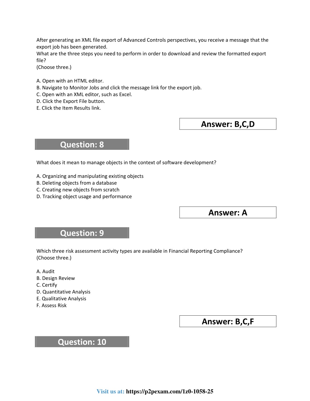 After generating an XML file export of Advanced Controls perspectives, you receive a message that the export job has been generated. What are the three steps you need to perform in order to download and review the formatted export file? (Choose three.) A.Open with an HTML editor. B.Navigate to Monitor Jobs and click the message link for the export job. C.Open with an XML editor, such as Excel. D.Click the Export File button. E.Click the Item Results link. Answer: B,C,D Question: 8 What does it mean to manage objects in the context of software development? A.Organizing and manipulating existing objects B.Deleting objects from a database C.Creating new objects from scratch D.Tracking object usage and performance Answer: A Question: 9 Which three risk assessment activity types are available in Financial Reporting Compliance? (Choose three.) A.Audit B.Design Review C.Certify D.Quantitative Analysis E.Qualitative Analysis F.Assess Risk Answer: B,C,F Question: 10 Visit us at: https://p2pexam.com/1z0-1058-25