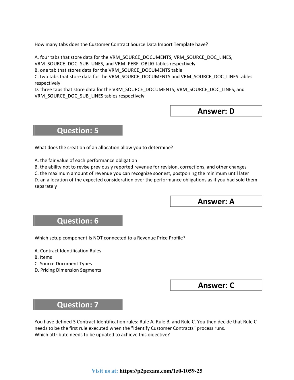 How many tabs does the Customer Contract Source Data Import Template have? A.four tabs that store data for the VRM_SOURCE_DOCUMENTS, VRM_SOURCE_DOC_LINES, VRM_SOURCE_DOC_SUB_UNES, and VRM_PERF_OBLIG tables respectively B.one tab that stores data for the VRM_SOURCE_DOCUMENTS table C.two tabs that store data for the VRM_SOURCE_DOCUMENTS and VRM_SOURCE_DOC_LINES tables respectively D.three tabs that store data for the VRM_SOURCE_DOCUMENTS, VRM_SOURCE_DOC_LINES, and VRM_SOURCE_DOC_SUB_LINES tables respectively Answer: D Question: 5 What does the creation of an allocation allow you to determine? A.the fair value of each performance obligation B.the ability not to revise previously reported revenue for revision, corrections, and other changes C.the maximum amount of revenue you can recognize soonest, postponing the minimum until later D.an allocation of the expected consideration over the performance obligations as if you had sold them separately Answer: A Question: 6 Which setup component Is NOT connected to a Revenue Price Profile? A.Contract Identification Rules B.Items C.Source Document Types D.Pricing Dimension Segments Answer: C Question: 7 You have defined 3 Contract Identification rules: Rule A, Rule B, and Rule C. You then decide that Rule C needs to be the first rule executed when the "Identify Customer Contracts" process runs. Which attribute needs to be updated to achieve this objective? Visit us at: https://p2pexam.com/1z0-1059-25