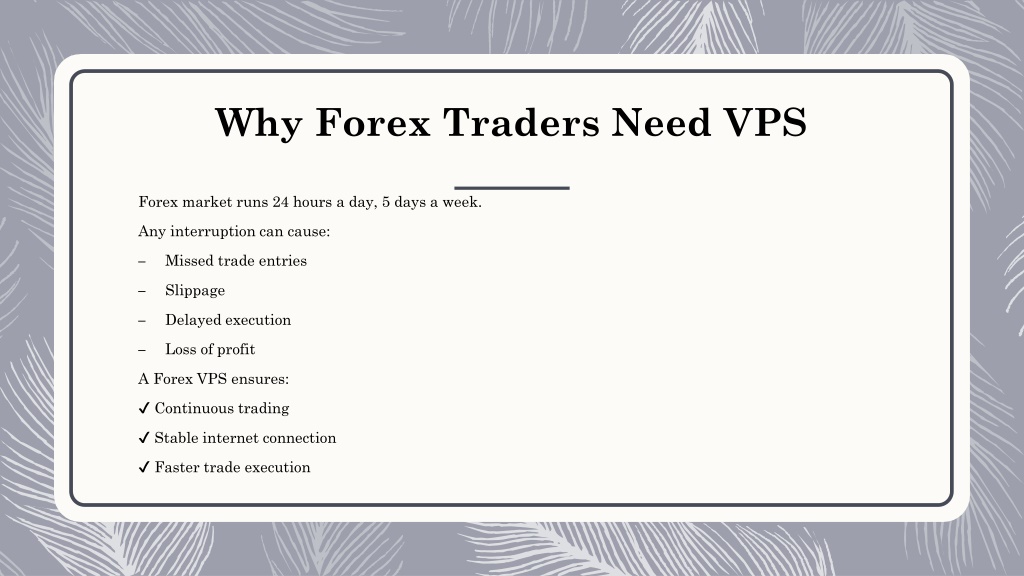 Why Forex Traders Need VPS Forex market runs 24 hours a day, 5 days a week. Any interruption can cause: Missed trade entries – Slippage – Delayed execution – Loss of profit – A Forex VPS ensures: ✔ Continuous trading ✔ Stable internet connection ✔ Faster trade execution
