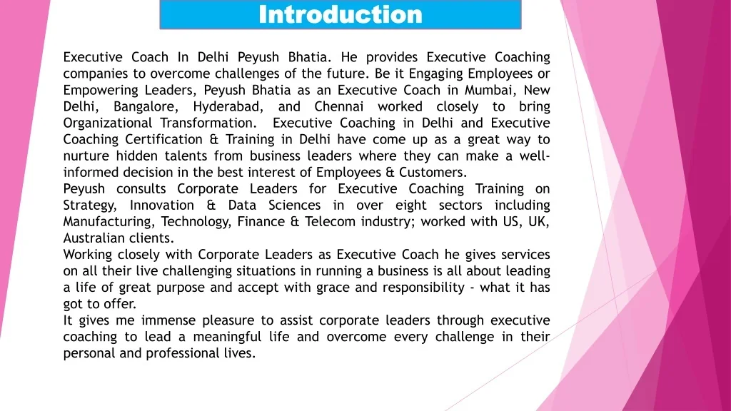 Introduction Executive Coach In Delhi Peyush Bhatia. He provides Executive Coaching companies to overcome challenges of the future. Be it Engaging Employees or Empowering Leaders, Peyush Bhatia as an Executive Coach in Mumbai, New Delhi, Bangalore, Hyderabad, and Chennai worked closely to bring Organizational Transformation. Executive Coaching in Delhi and Executive Coaching Certification & Training in Delhi have come up as a great way to nurture hidden talents from business leaders where they can make a well-informed decision in the best interest of Employees & Customers. Peyush consults Corporate Leaders for Executive Coaching Training on Strategy, Innovation & Data Sciences in over eight sectors including Manufacturing, Technology, Finance & Telecom industry; worked with US, UK, Australian clients. Working closely with Corporate Leaders as Executive Coach he gives services on all their live challenging situations in running a business is all about leading a life of great purpose and accept with grace and responsibility - what it has got to offer. It gives me immense pleasure to assist corporate leaders through executive coaching to lead a meaningful life and overcome every challenge in their personal and professional lives.