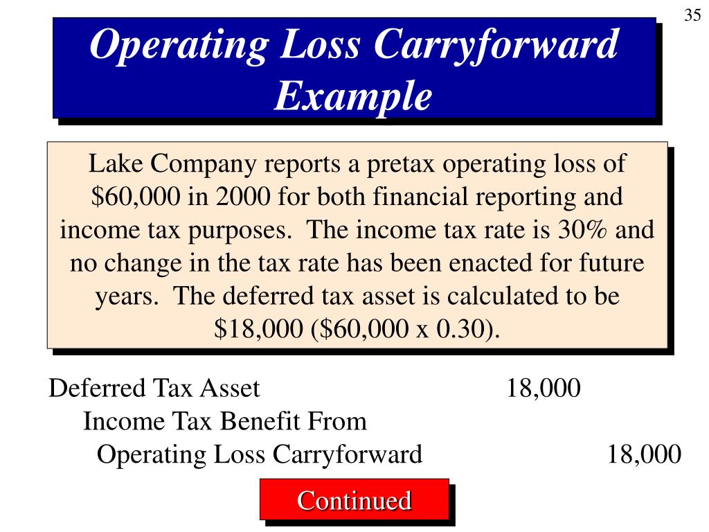 Operating Loss Carryforward Example Lake Company reports a pretax operating loss of $60,000 in 2000 for both financial reporting and income tax purposes. The income tax rate is 30% and no change in the tax rate has been enacted for future years. The deferred tax asset is calculated to be $18,000 ($60,000 x 0.30). Deferred Tax Asset 18,000 Income Tax Benefit From Operating Loss Carryforward 18,000 Continued
