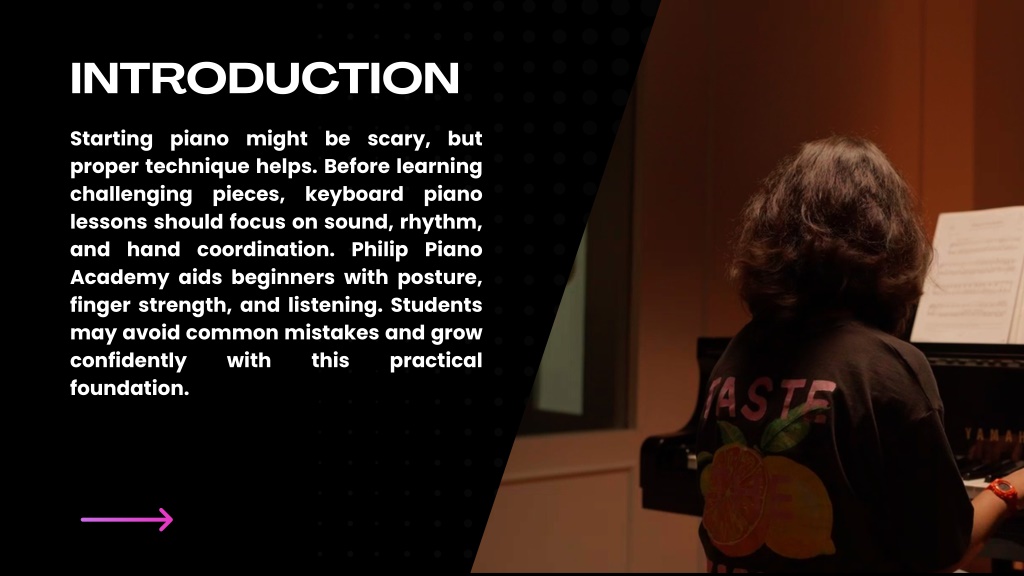 INTRODUCTION Starting piano might be scary, but proper technique helps. Before learning challenging pieces, keyboard piano lessons should focus on sound, rhythm, and hand coordination. Philip Piano Academy aids beginners with posture, finger strength, and listening. Students may avoid common mistakes and grow confidently with foundation. this practical
