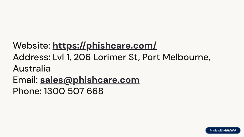 Website: https://phishcare.com/ Address: Lvl 1, 206 Lorimer St, Port Melbourne, Australia Email: sales@phishcare.com Phone: 1300 507 668
