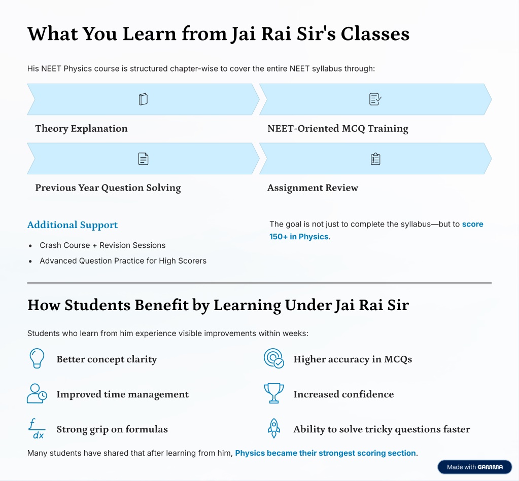 What You Learn from Jai Rai Sir's Classes His NEET Physics course is structured chapter-wise to cover the entire NEET syllabus through: Theory Explanation NEET-Oriented MCQ Training Previous Year Question Solving Assignment Review The goal is not just to complete the syllabus4but to score 150+ in Physics. Additional Support Crash Course + Revision Sessions Advanced Question Practice for High Scorers How Students Benefit by Learning Under Jai Rai Sir Students who learn from him experience visible improvements within weeks: Better concept clarity Higher accuracy in MCQs Improved time management Increased confidence Strong grip on formulas Ability to solve tricky questions faster Many students have shared that after learning from him, Physics became their strongest scoring section.