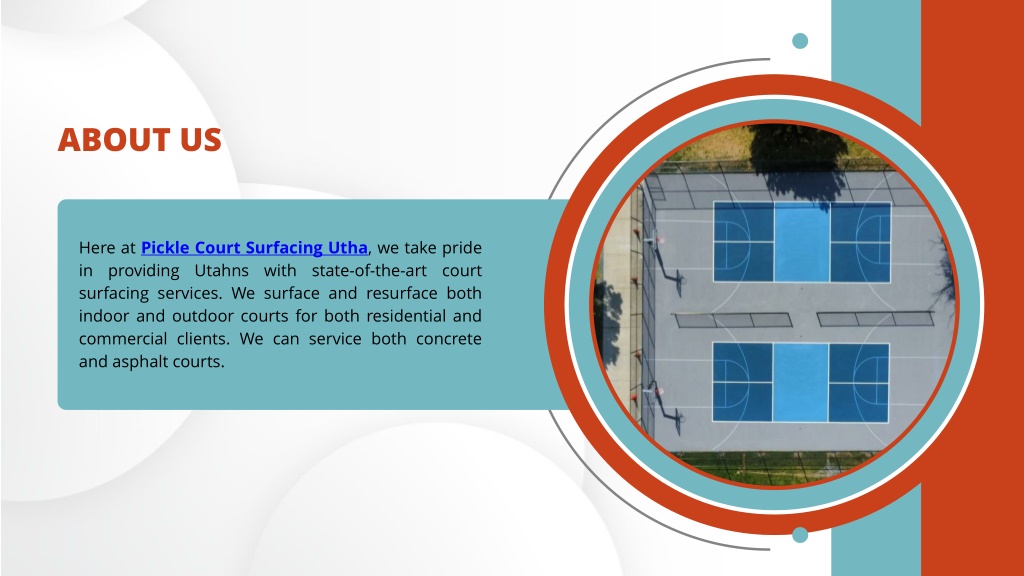 ABOUT US Here at Pickle Court Surfacing Utha, we take pride in providing Utahns with state-of-the-art court surfacing services. We surface and resurface both indoor and outdoor courts for both residential and commercial clients. We can service both concrete and asphalt courts.