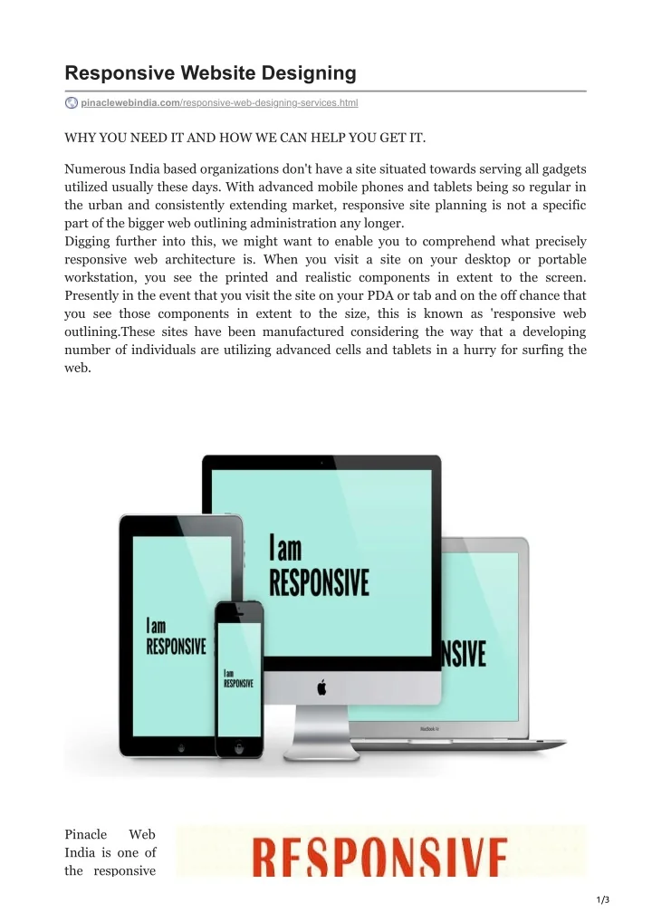 Pinacle Web India is one of the responsive web architecture benefits in India that gives careful consideration to web advancement for this uncompromising need. We utilize a scope of most recent web advancement advances that assistance us make a consistent client encounter for your customers.<br><br>Pinacle Web India has a devoted group for web improvement and web outlining that spends significant time in responsive web composition and has been taking a shot at such activities for a significant time. The combined understanding of our colleagues, combined with advancement and demonstrable skill, guara