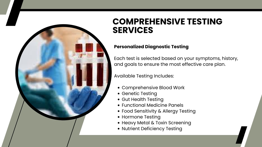 COMPREHENSIVE TESTING SERVICES Personalized Diagnostic Testing Each test is selected based on your symptoms, history, and goals to ensure the most effective care plan. Available Testing Includes: Comprehensive Blood Work Genetic Testing Gut Health Testing Functional Medicine Panels Food Sensitivity & Allergy Testing Hormone Testing Heavy Metal & Toxin Screening Nutrient Deficiency Testing