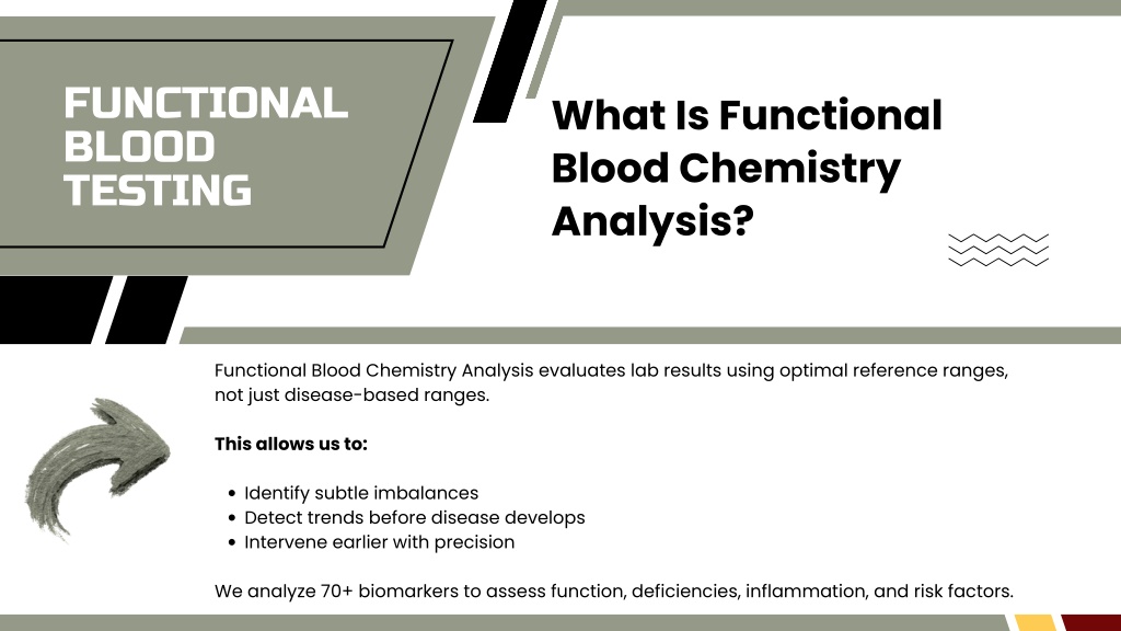 FUNCTIONAL BLOOD TESTING What Is Functional Blood Chemistry Analysis? Functional Blood Chemistry Analysis evaluates lab results using optimal reference ranges, not just disease-based ranges. This allows us to: Identify subtle imbalances Detect trends before disease develops Intervene earlier with precision We analyze 70+ biomarkers to assess function, deficiencies, inflammation, and risk factors.