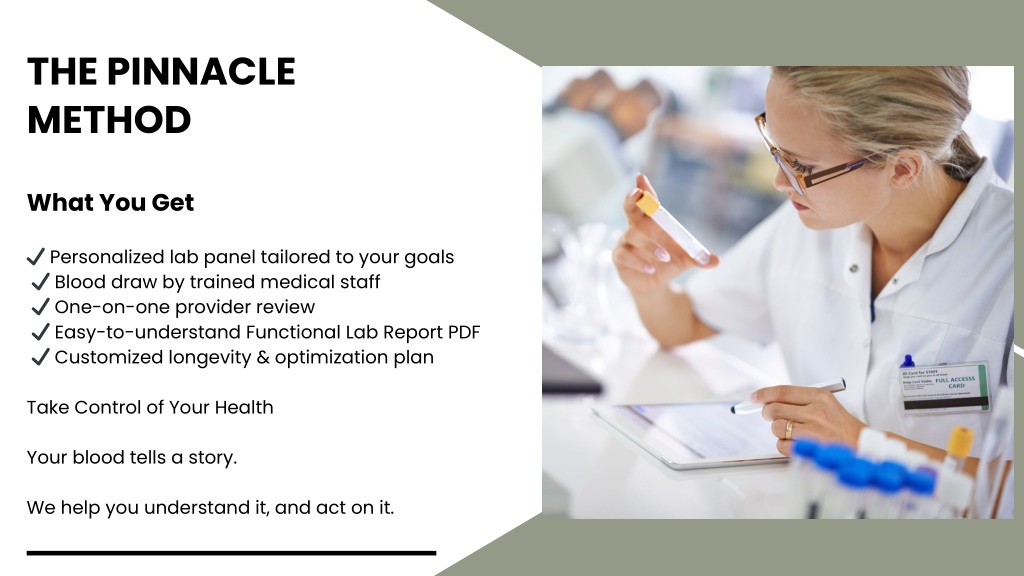 THE PINNACLE METHOD What You Get ✔ Personalized lab panel tailored to your goals ✔ Blood draw by trained medical staff ✔ One-on-one provider review ✔ Easy-to-understand Functional Lab Report PDF ✔ Customized longevity & optimization plan Take Control of Your Health Your blood tells a story. We help you understand it, and act on it.