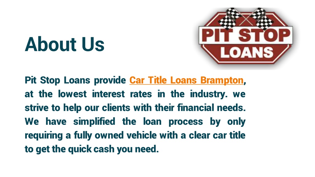 About Us Pit Stop Loans provide Car Title Loans Brampton, at the lowest interest rates in the industry. we strive to help our clients with their financial needs. We have simplified the loan process by only requiring a fully owned vehicle with a clear car title to get the quick cash you need.
