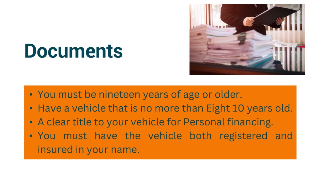 Documents • You must be nineteen years of age or older. • Have a vehicle that is no more than Eight 10 years old. • A clear title to your vehicle for Personal financing. • You must have the vehicle both registered and insured in your name.