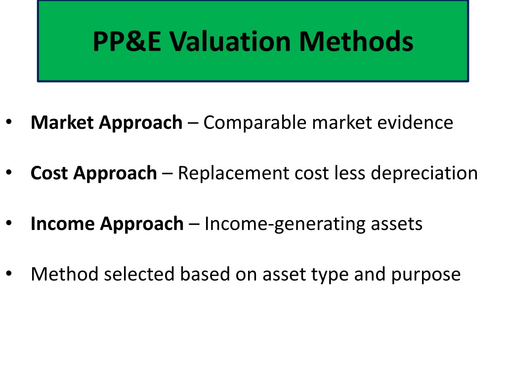 Market Approach – Comparable market evidence • Cost Approach – Replacement cost less depreciation • Income Approach – Income-generating assets • Method selected based on asset type and purpose PP&E Valuation Methods