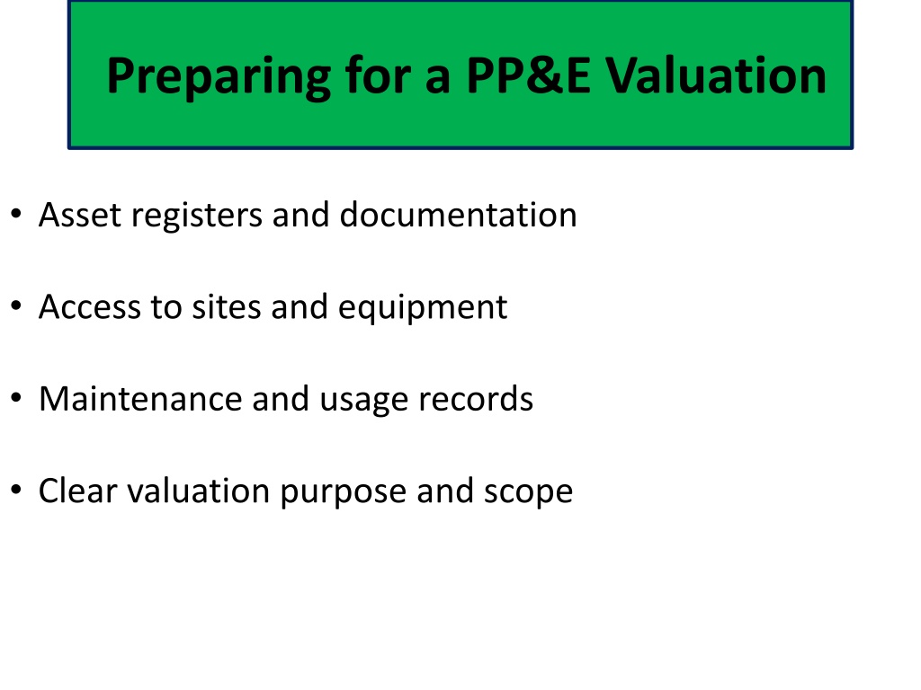 Asset registers and documentation • Access to sites and equipment • Maintenance and usage records • Clear valuation purpose and scope Preparing for a PP&E Valuation