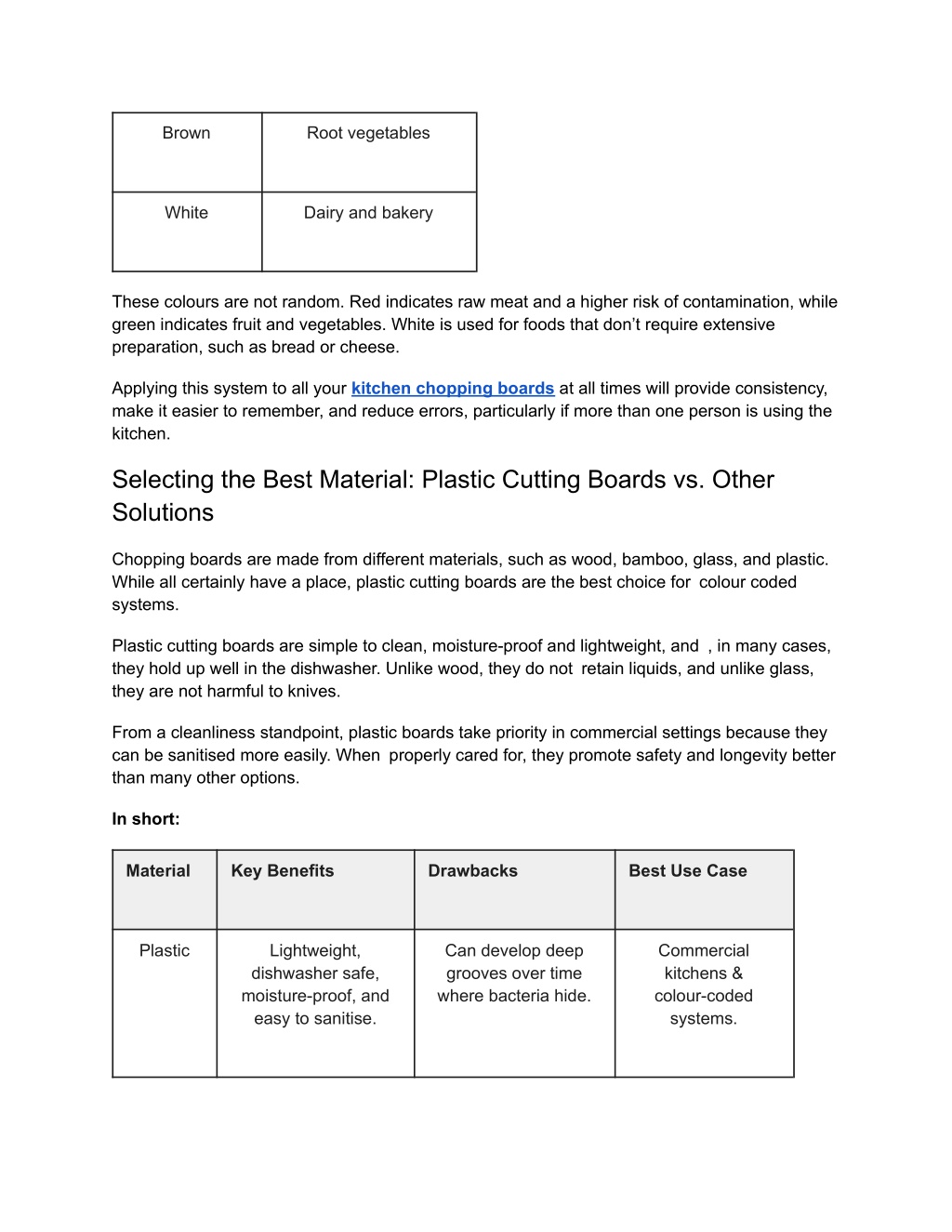 Brown Root vegetables White Dairy and bakery These colours are not random. Red indicates raw meat and a higher risk of contamination, while green indicates fruit and vegetables. White is used for foods that don’t require extensive preparation, such as bread or cheese. Applying this system to all your kitchen chopping boards at all times will provide consistency, make it easier to remember, and reduce errors, particularly if more than one person is using the kitchen. Selecting the Best Material: Plastic Cutting Boards vs. Other Solutions Chopping boards are made from different materials, such as wood, bamboo, glass, and plastic. While all certainly have a place, plastic cutting boards are the best choice for colour coded systems. Plastic cutting boards are simple to clean, moisture-proof and lightweight, and , in many cases, they hold up well in the dishwasher. Unlike wood, they do not retain liquids, and unlike glass, they are not harmful to knives. From a cleanliness standpoint, plastic boards take priority in commercial settings because they can be sanitised more easily. When properly cared for, they promote safety and longevity better than many other options. In short: Material Key Benefits Drawbacks Best Use Case Plastic Lightweight, dishwasher safe, moisture-proof, and easy to sanitise. Can develop deep grooves over time where bacteria hide. Commercial kitchens & colour-coded systems.