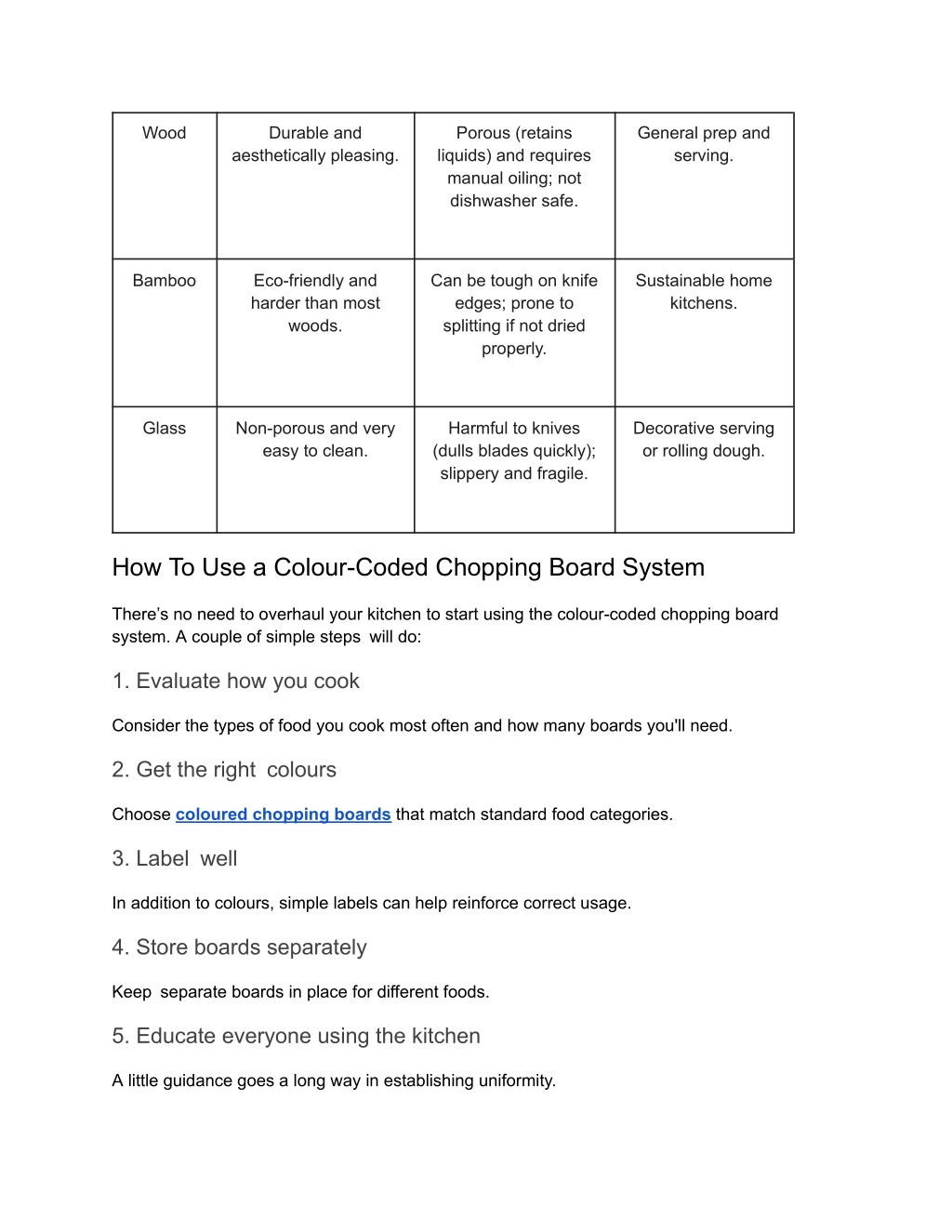 Wood Durable and aesthetically pleasing. Porous (retains liquids) and requires manual oiling; not dishwasher safe. General prep and serving. Bamboo Eco-friendly and harder than most woods. Can be tough on knife edges; prone to splitting if not dried properly. Sustainable home kitchens. Glass Non-porous and very easy to clean. Harmful to knives (dulls blades quickly); slippery and fragile. Decorative serving or rolling dough. How To Use a Colour-Coded Chopping Board System There’s no need to overhaul your kitchen to start using the colour-coded chopping board system. A couple of simple steps will do: 1. Evaluate how you cook Consider the types of food you cook most often and how many boards you'll need. 2. Get the right colours Choose coloured chopping boards that match standard food categories. 3. Label well In addition to colours, simple labels can help reinforce correct usage. 4. Store boards separately Keep separate boards in place for different foods. 5. Educate everyone using the kitchen A little guidance goes a long way in establishing uniformity.