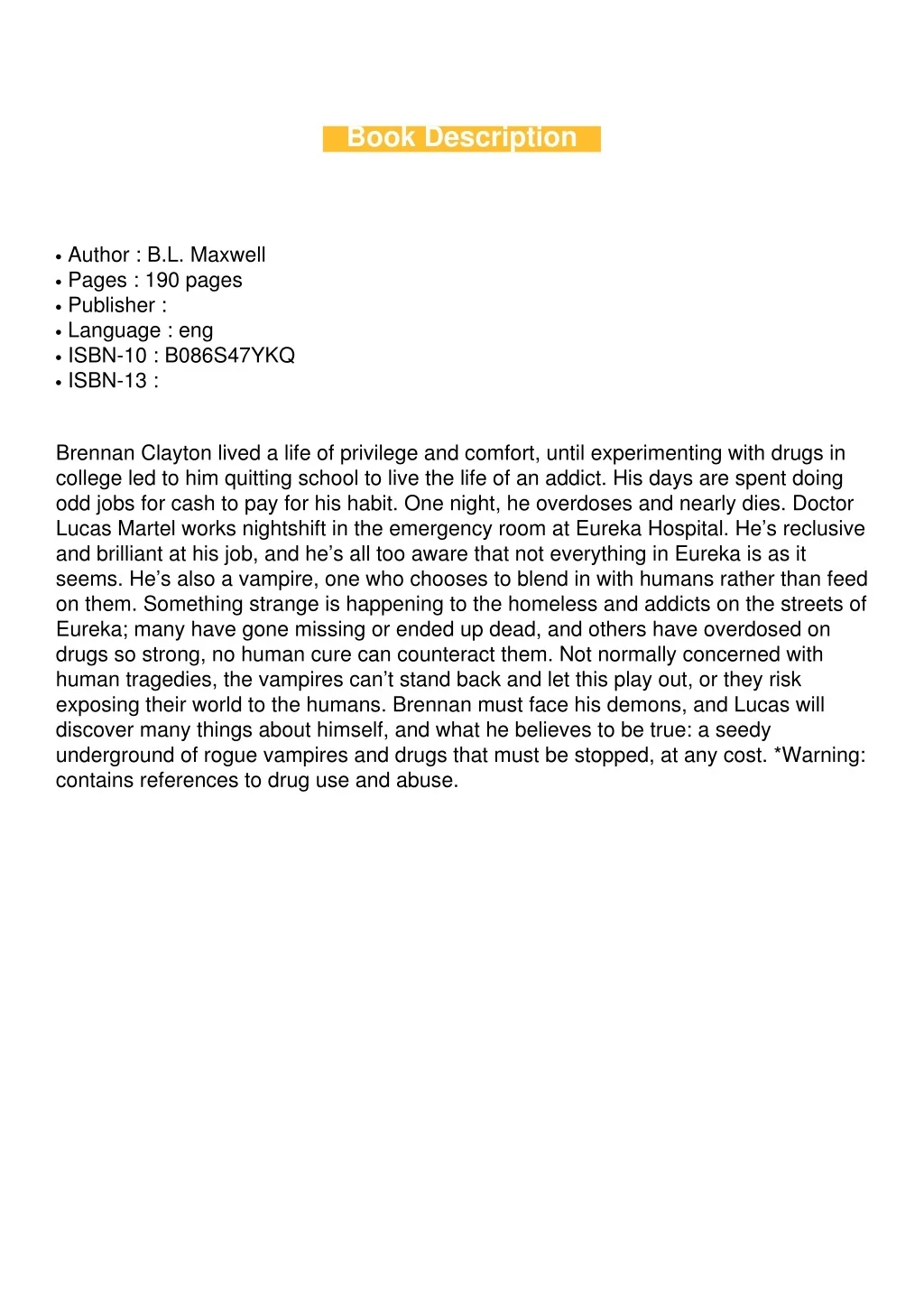 Book Description Author : B.L. Maxwell Pages : 190 pages Publisher : Language : eng ISBN-10 : B086S47YKQ ISBN-13 : G G G G G G Brennan Clayton lived a life of privilege and comfort, until experimenting with drugs in college led to him quitting school to live the life of an addict. His days are spent doing odd jobs for cash to pay for his habit. One night, he overdoses and nearly dies. Doctor Lucas Martel works nightshift in the emergency room at Eureka Hospital. He’s reclusive and brilliant at his job, and he’s all too aware that not everything in Eureka is as it seems. He’s also a vampire, one who chooses to blend in with humans rather than feed on them. Something strange is happening to the homeless and addicts on the streets of Eureka; many have gone missing or ended up dead, and others have overdosed on drugs so strong, no human cure can counteract them. Not normally concerned with human tragedies, the vampires can’t stand back and let this play out, or they risk exposing their world to the humans. Brennan must face his demons, and Lucas will discover many things about himself, and what he believes to be true: a seedy underground of rogue vampires and drugs that must be stopped, at any cost. *Warning: contains references to drug use and abuse.