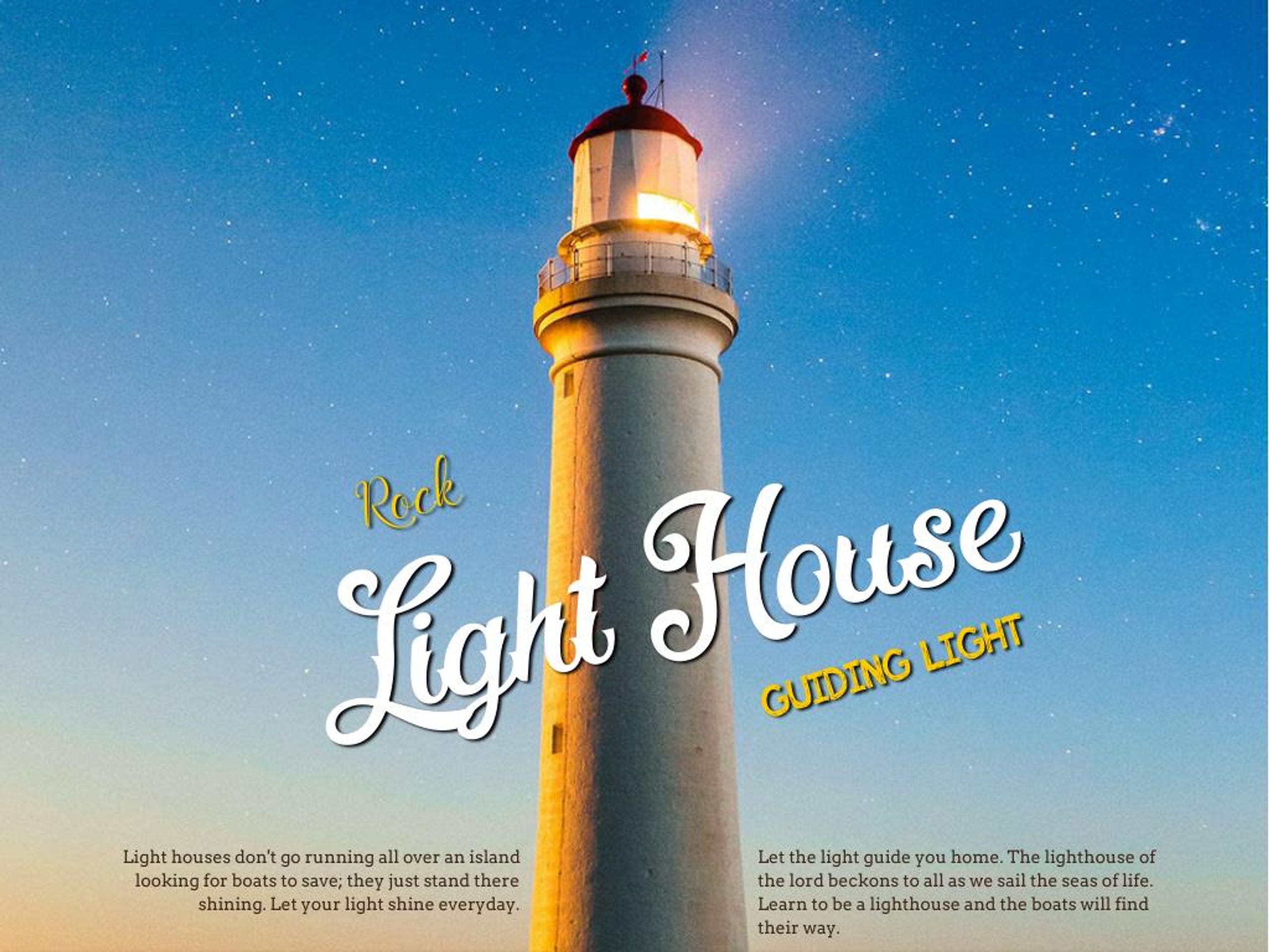 Light House Rock GUIDING LIGHT Light houses don't go running all over an island looking for boats to save; they just stand there shining. Let your light shine everyday. Let the light guide you home. The lighthouse of the lord beckons to all as we sail the seas of life. Learn to be a lighthouse and the boats will find their way.