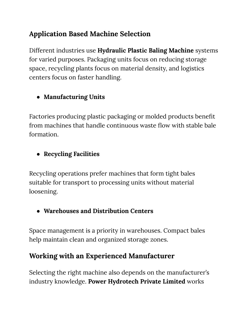 closely with industrial clients to understand application needs, production volume, and space availability. This practical approach helps match machine specifications with actual working conditions rather than generic sizing. The company focuses on solid machine construction, stable hydraulic systems, and practical control layouts. Support during installation and operational guidance helps industries integrate the machine into existing workflows smoothly. Why Choose Us Power Hydrotech Private Limited focuses on industrial requirements backed by engineering experience and application based understanding. The machines are developed with attention to material handling challenges faced by Indian industries. Clear communication, technical clarity, and post supply assistance help build long term working relationships with clients across multiple sectors. Conclusion Selecting the right Hydraulic Plastic Baling Machine involves understanding waste type, output needs, available space, and operational expectations. A carefully selected machine supports better waste handling, organized storage, and improved material movement within industrial facilities. With practical machine design and industry focused solutions, Power Hydrotech Private Limited supports businesses in managing plastic waste efficiently while maintaining consistent operational flow.