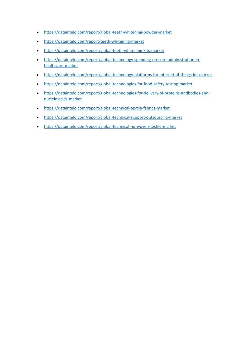 • https://dataintelo.com/report/global-teeth-whitening-powder-market • https://dataintelo.com/report/teeth-whitening-market • https://dataintelo.com/report/global-teeth-whitening-kits-market • https://dataintelo.com/report/global-technology-spending-on-core-administration-in- healthcare-market • https://dataintelo.com/report/global-technology-platforms-for-internet-of-things-iot-market • https://dataintelo.com/report/global-technologies-for-food-safety-testing-market • https://dataintelo.com/report/global-technologies-for-delivery-of-proteins-antibodies-and- nucleic-acids-market • https://dataintelo.com/report/global-technical-textile-fabrics-market • https://dataintelo.com/report/global-technical-support-outsourcing-market • https://dataintelo.com/report/global-technical-no-woven-textile-market