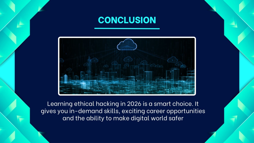 CONCLUSION Learning ethical hacking in 2026 is a smart choice. It gives you in-demand skills, exciting career opportunities and the ability to make digital world safer