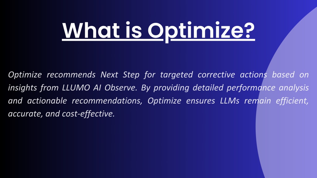 What is Optimize? Optimize recommends Next Step for targeted corrective actions based on insights from LLUMO AI Observe. By providing detailed performance analysis and actionable recommendations, Optimize ensures LLMs remain efficient, accurate, and cost-effective.
