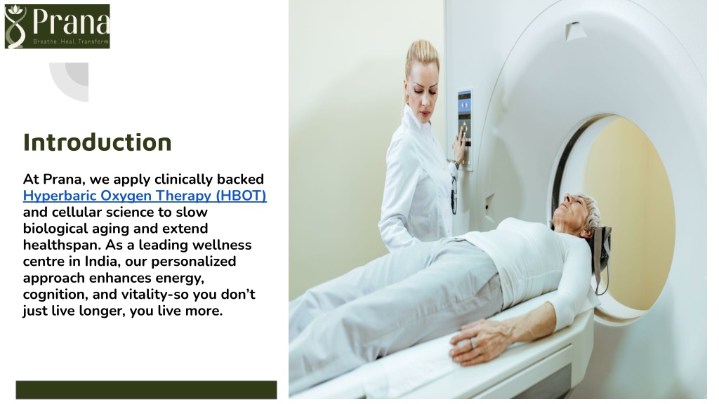 Introduction At Prana, we apply clinically backed Hyperbaric Oxygen Therapy (HBOT) and cellular science to slow biological aging and extend healthspan. As a leading wellness centre in India, our personalized approach enhances energy, cognition, and vitality-so you don’t just live longer, you live more.