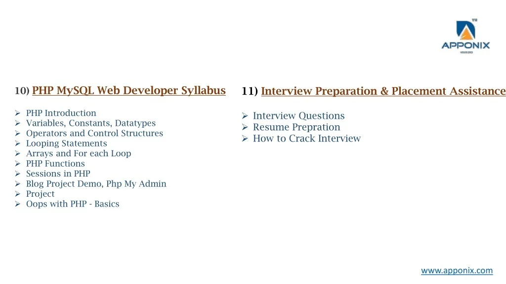 10) PHP MySQL Web Developer Syllabus • PHP Introduction • Variables, Constants, Datatypes • Operators and Control Structures • Looping Statements • Arrays and For each Loop • PHP Functions • Sessions in PHP • Blog Project Demo, Php My Admin • Project • Oops with PHP - Basics • 11) Interview Preparation & Placement Assistance • Interview Questions • Resume Prepration • How to Crack Interview www.apponix.com