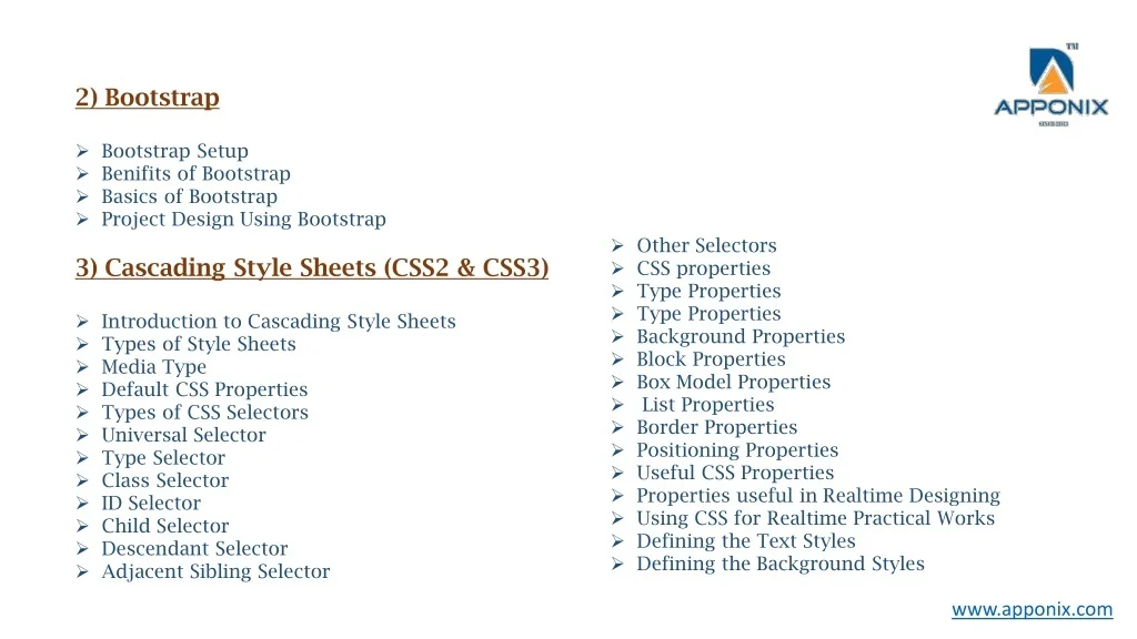 2) Bootstrap • Bootstrap Setup • Benifits of Bootstrap • Basics of Bootstrap • Project Design Using Bootstrap • 3) Cascading Style Sheets (CSS2 & CSS3) • Introduction to Cascading Style Sheets • Types of Style Sheets • Media Type • Default CSS Properties • Types of CSS Selectors • Universal Selector • Type Selector • Class Selector • ID Selector • Child Selector • Descendant Selector • Adjacent Sibling Selector • Other Selectors • CSS properties • Type Properties • Type Properties • Background Properties • Block Properties • Box Model Properties • List Properties • Border Properties • Positioning Properties • Useful CSS Properties • Properties useful in Realtime Designing • Using CSS for Realtime Practical Works • Defining the Text Styles • Defining the Background Styles www.apponix.com