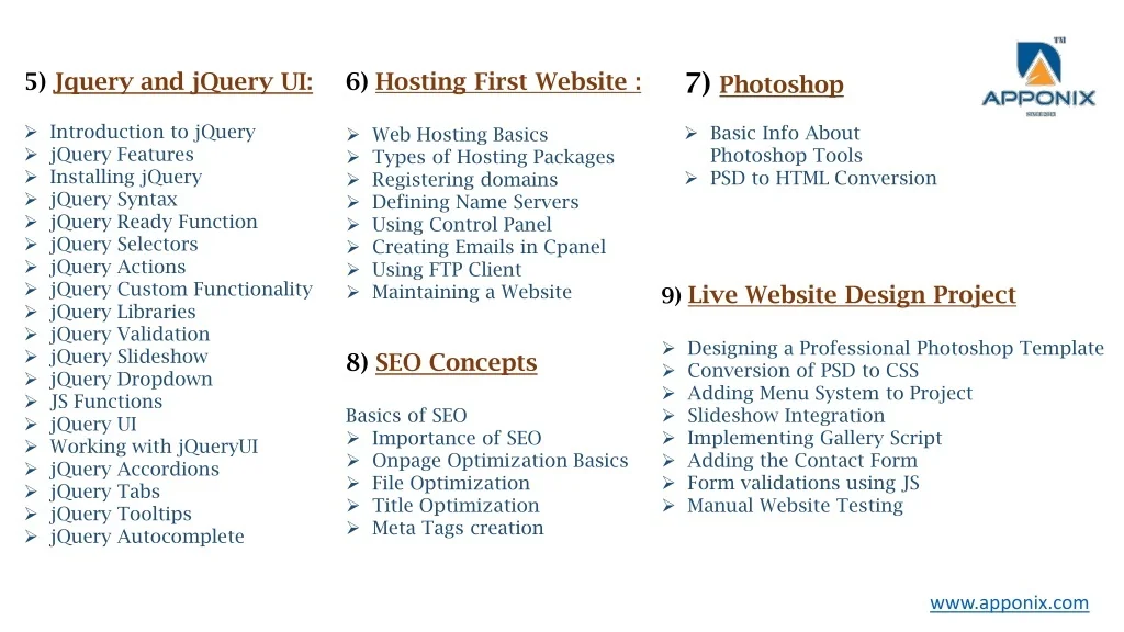 5) Jquery and jQuery UI: • Introduction to jQuery • jQuery Features • Installing jQuery • jQuery Syntax • jQuery Ready Function • jQuery Selectors • jQuery Actions • jQuery Custom Functionality • jQuery Libraries • jQuery Validation • jQuery Slideshow • jQuery Dropdown • JS Functions • jQuery UI • Working with jQueryUI • jQuery Accordions • jQuery Tabs • jQuery Tooltips • jQuery Autocomplete • 6)Hosting First Website : • Web Hosting Basics • Types of Hosting Packages • Registering domains • Defining Name Servers • Using Control Panel • Creating Emails in Cpanel • Using FTP Client • Maintaining a Website • 8) SEO Concepts • Basics of SEO • Importance of SEO • Onpage Optimization Basics • File Optimization • Title Optimization • Meta Tags creation • 7) Photoshop • Basic Info About Photoshop Tools • PSD to HTML Conversion • 9) Live Website Design Project • Designing a Professional Photoshop Template • Conversion of PSD to CSS • Adding Menu System to Project • Slideshow Integration • Implementing Gallery Script • Adding the Contact Form • Form validations using JS • Manual Website Testing www.apponix.com