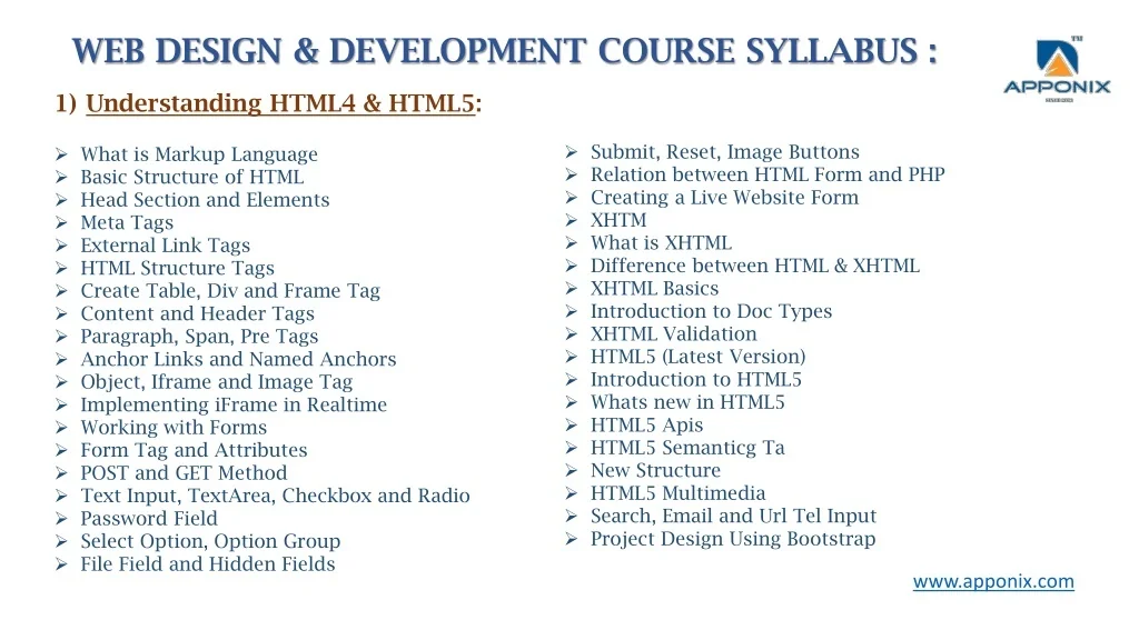 WEB DESIGN & DEVELOPMENT COURSE SYLLABUS : • Understanding HTML4 & HTML5: • What is Markup Language • Basic Structure of HTML • Head Section and Elements • Meta Tags • External Link Tags • HTML Structure Tags • Create Table, Div and Frame Tag • Content and Header Tags • Paragraph, Span, Pre Tags • Anchor Links and Named Anchors • Object, Iframe and Image Tag • Implementing iFrame in Realtime • Working with Forms • Form Tag and Attributes • POST and GET Method • Text Input, TextArea, Checkbox and Radio • Password Field • Select Option, Option Group • File Field and Hidden Fields • Submit, Reset, Image Buttons • Relation between HTML Form and PHP • Creating a Live Website Form • XHTM • What is XHTML • Difference between HTML & XHTML • XHTML Basics • Introduction to Doc Types • XHTML Validation • HTML5 (Latest Version) • Introduction to HTML5 • Whats new in HTML5 • HTML5 Apis • HTML5 Semanticg Ta • New Structure • HTML5 Multimedia • Search, Email and Url Tel Input • Project Design Using Bootstrap www.apponix.com