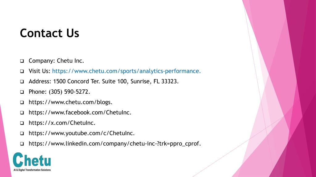 Contact Us • Company: Chetu Inc. • Visit Us: https://www.chetu.com/sports/analytics-performance. • Address: 1500 Concord Ter. Suite 100, Sunrise, FL 33323. • Phone: (305) 590-5272. • https://www.chetu.com/blogs. • https://www.facebook.com/ChetuInc. • https://x.com/ChetuInc. • https://www.youtube.com/c/ChetuInc. • https://www.linkedin.com/company/chetu-inc-?trk=ppro_cprof.