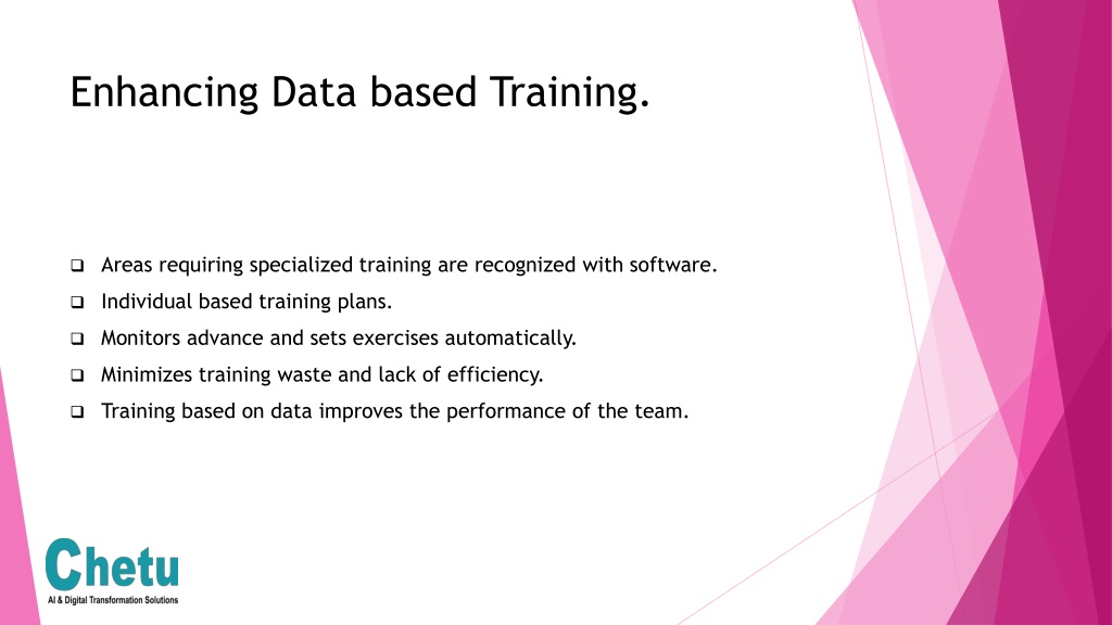 Enhancing Data based Training. • Areas requiring specialized training are recognized with software. • Individual based training plans. • Monitors advance and sets exercises automatically. • Minimizes training waste and lack of efficiency. • Training based on data improves the performance of the team.