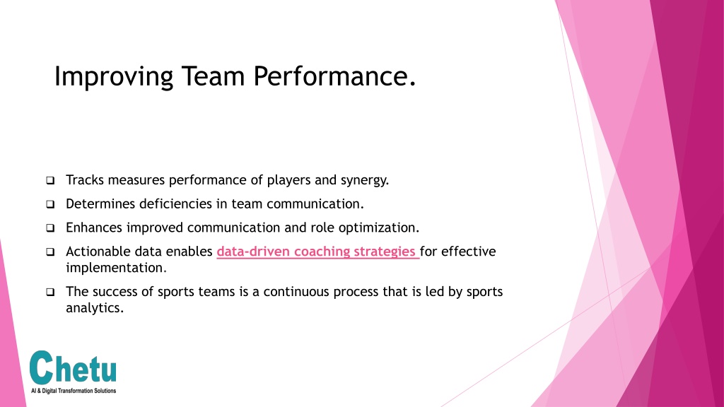 Improving Team Performance. • Tracks measures performance of players and synergy. • Determines deficiencies in team communication. • Enhances improved communication and role optimization. • Actionable data enables data-driven coaching strategiesfor effective implementation. • The success of sports teams is a continuous process that is led by sports analytics.