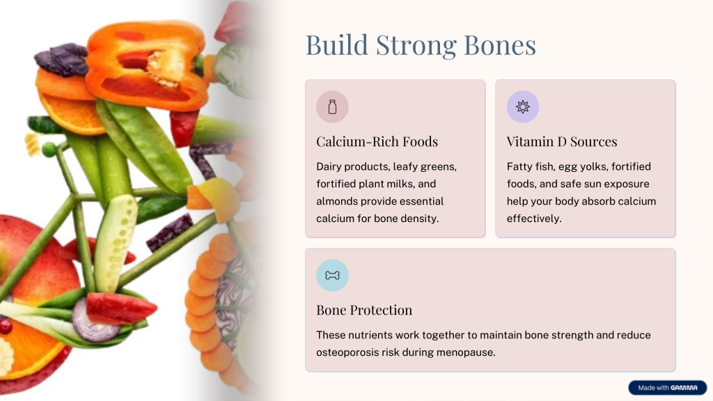 Build Strong Bones Calcium-Rich Foods Vitamin D Sources Dairy products, leafy greens, fortified plant milks, and almonds provide essential calcium for bone density. Fatty fish, egg yolks, fortified foods, and safe sun exposure help your body absorb calcium effectively. Bone Protection These nutrients work together to maintain bone strength and reduce osteoporosis risk during menopause.