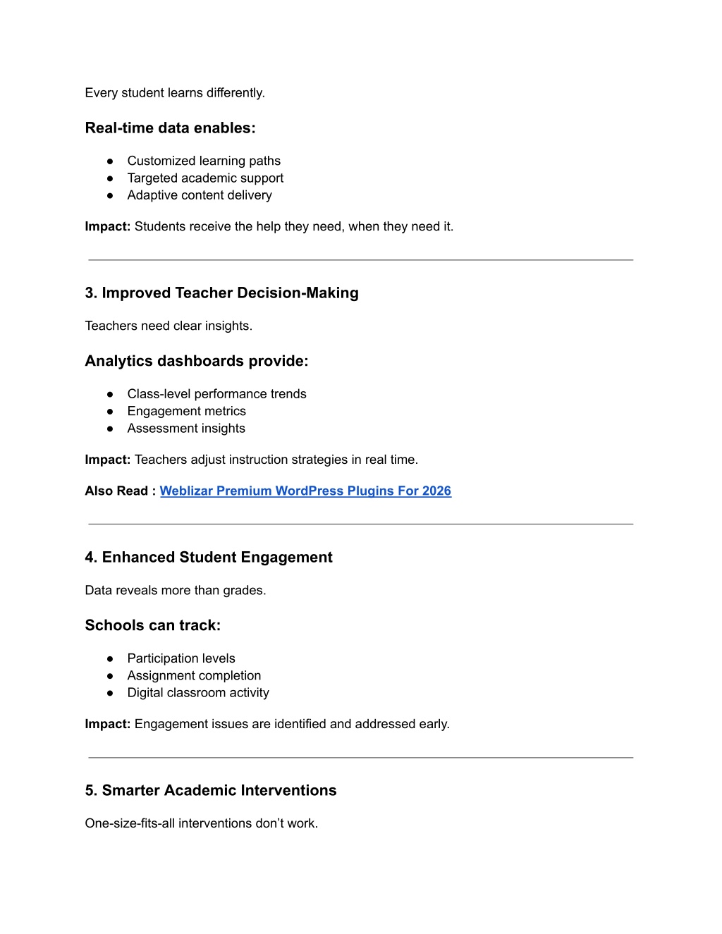 Every student learns differently. Real-time data enables: ● Customized learning paths ● Targeted academic support ● Adaptive content delivery Impact: Students receive the help they need, when they need it. 3. Improved Teacher Decision-Making Teachers need clear insights. Analytics dashboards provide: ● Class-level performance trends ● Engagement metrics ● Assessment insights Impact: Teachers adjust instruction strategies in real time. Also Read : Weblizar Premium WordPress Plugins For 2026 4. Enhanced Student Engagement Data reveals more than grades. Schools can track: ● Participation levels ● Assignment completion ● Digital classroom activity Impact: Engagement issues are identified and addressed early. 5. Smarter Academic Interventions One-size-fits-all interventions don’t work.