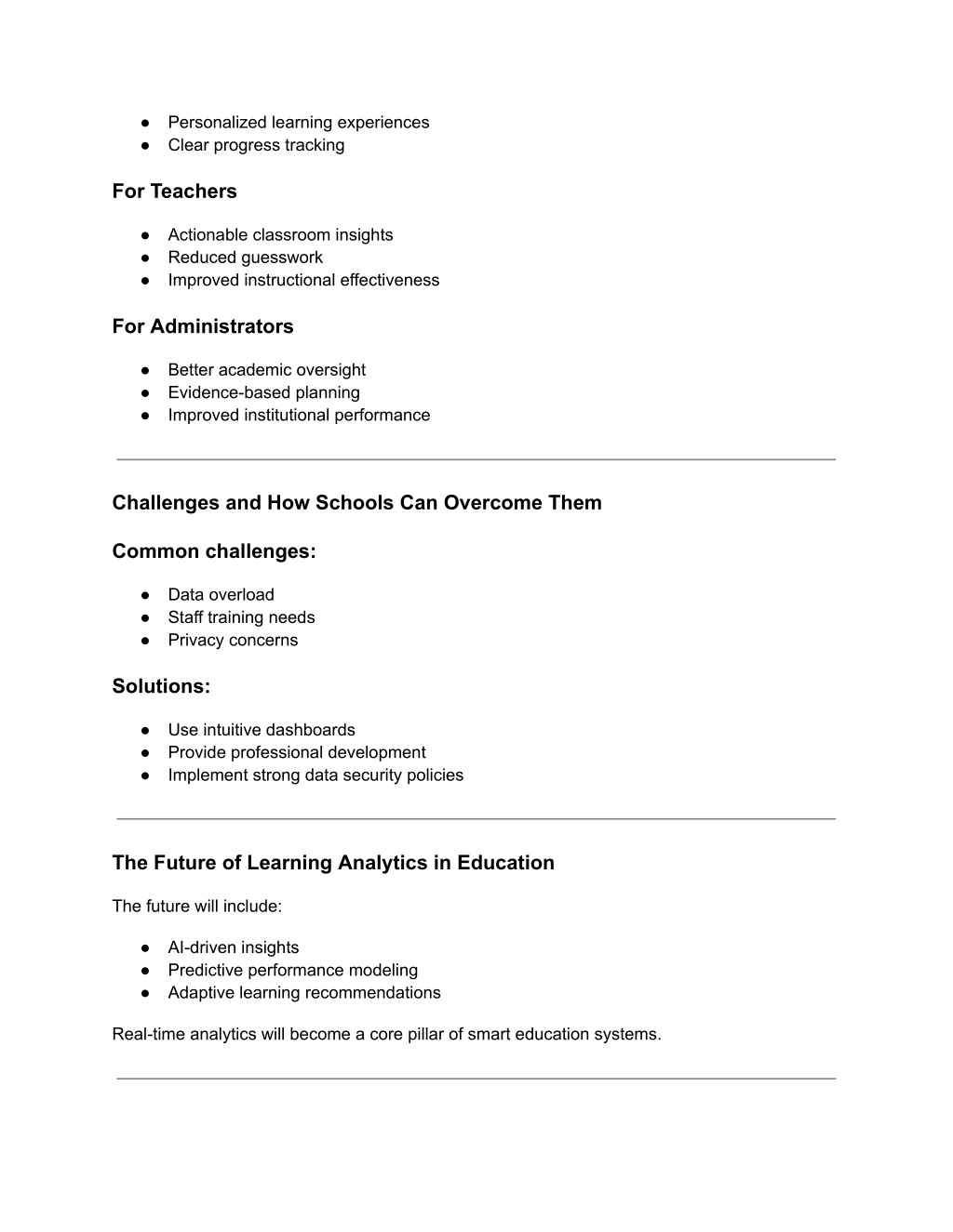 ● Personalized learning experiences ● Clear progress tracking For Teachers ● Actionable classroom insights ● Reduced guesswork ● Improved instructional effectiveness For Administrators ● Better academic oversight ● Evidence-based planning ● Improved institutional performance Challenges and How Schools Can Overcome Them Common challenges: ● Data overload ● Staff training needs ● Privacy concerns Solutions: ● Use intuitive dashboards ● Provide professional development ● Implement strong data security policies The Future of Learning Analytics in Education The future will include: ● AI-driven insights ● Predictive performance modeling ● Adaptive learning recommendations Real-time analytics will become a core pillar of smart education systems.