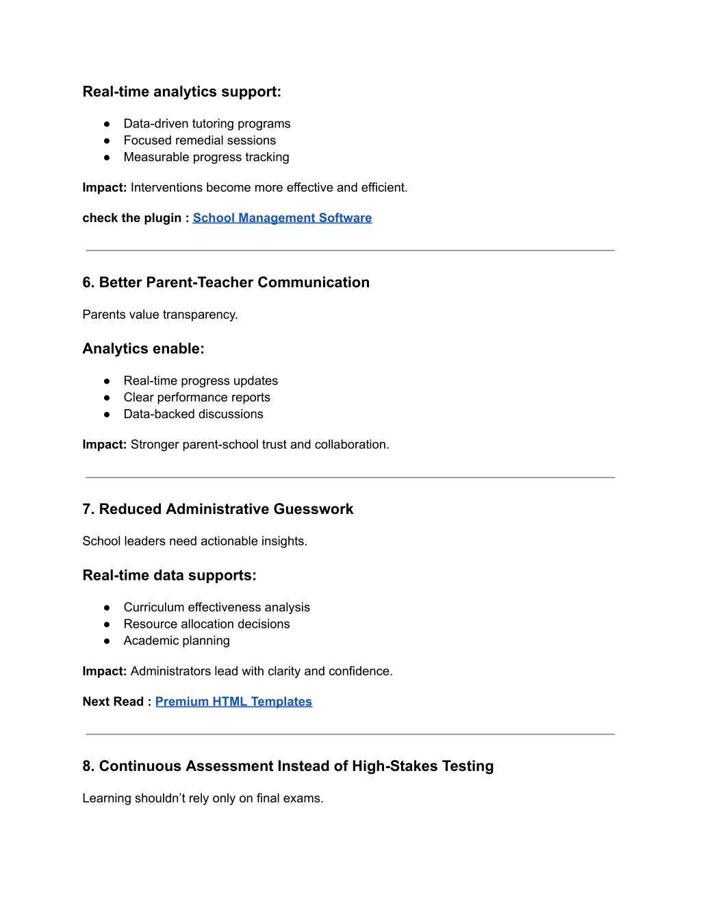 Real-time analytics support: ● Data-driven tutoring programs ● Focused remedial sessions ● Measurable progress tracking Impact: Interventions become more effective and efficient. check the plugin : School Management Software 6. Better Parent-Teacher Communication Parents value transparency. Analytics enable: ● Real-time progress updates ● Clear performance reports ● Data-backed discussions Impact: Stronger parent-school trust and collaboration. 7. Reduced Administrative Guesswork School leaders need actionable insights. Real-time data supports: ● Curriculum effectiveness analysis ● Resource allocation decisions ● Academic planning Impact: Administrators lead with clarity and confidence. Next Read : Premium HTML Templates 8. Continuous Assessment Instead of High-Stakes Testing Learning shouldn’t rely only on final exams.