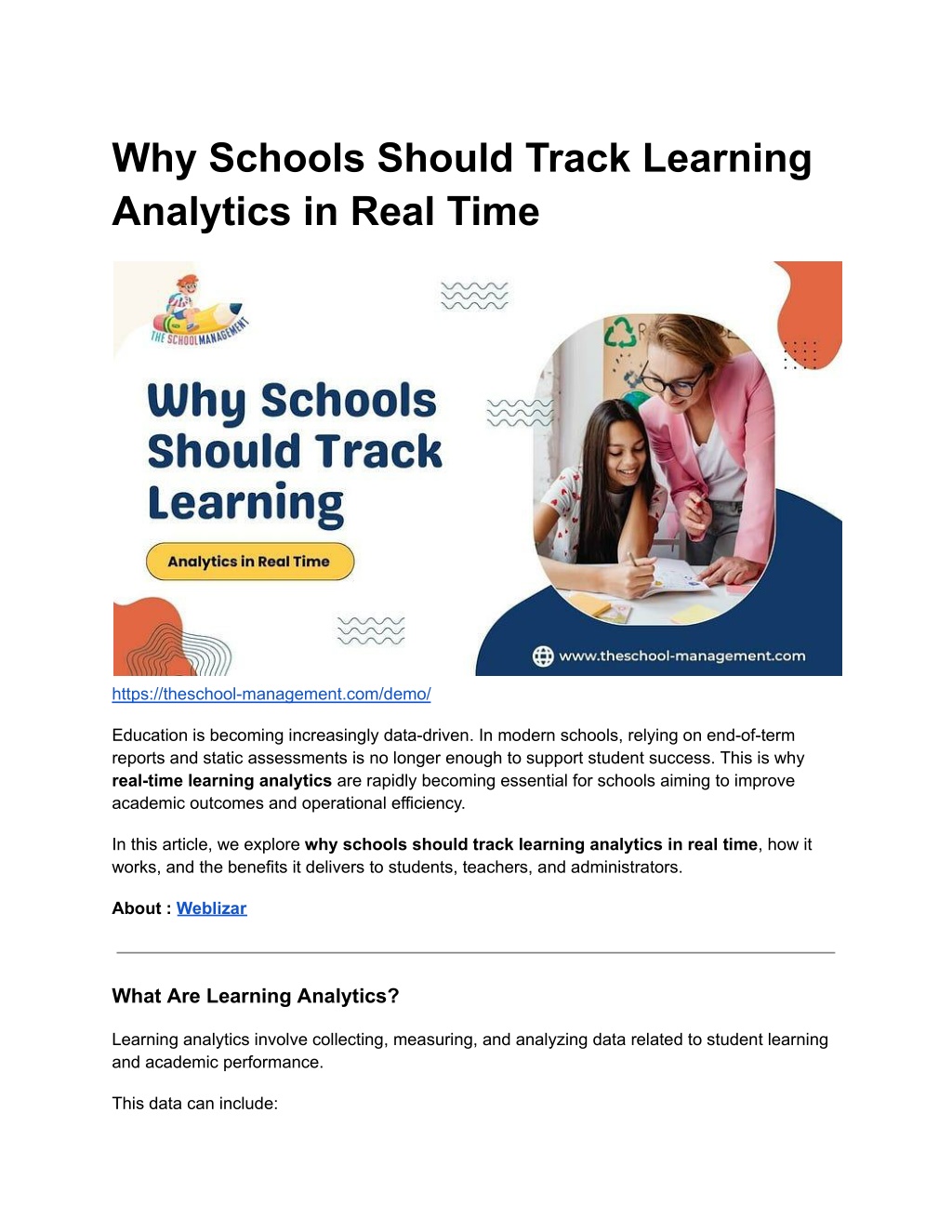 Why Schools Should Track Learning Analytics in Real Time https://theschool-management.com/demo/ Education is becoming increasingly data-driven. In modern schools, relying on end-of-term reports and static assessments is no longer enough to support student success. This is why real-time learning analytics are rapidly becoming essential for schools aiming to improve academic outcomes and operational efficiency. In this article, we explore why schools should track learning analytics in real time, how it works, and the benefits it delivers to students, teachers, and administrators. About : Weblizar What Are Learning Analytics? Learning analytics involve collecting, measuring, and analyzing data related to student learning and academic performance. This data can include: