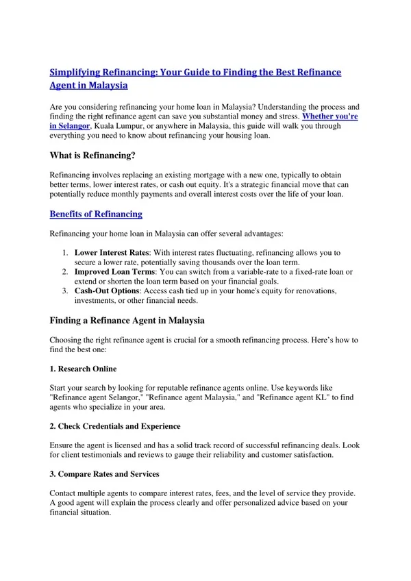 Simplifying Refinancing: Your Guide to Finding the Best Refinance Agent in Malaysia Are you considering refinancing your home loan in Malaysia? Understanding the process and finding the right refinance agent can save you substantial money and stress. Whether you're in Selangor, Kuala Lumpur, or anywhere in Malaysia, this guide will walk you through everything you need to know about refinancing your housing loan. What is Refinancing? Refinancing involves replacing an existing mortgage with a new one, typically to obtain better terms, lower interest rates, or cash out equity. It's a strategic financial move that can potentially reduce monthly payments and overall interest costs over the life of your loan. Benefits of Refinancing Refinancing your home loan in Malaysia can offer several advantages: 1.Lower Interest Rates: With interest rates fluctuating, refinancing allows you to secure a lower rate, potentially saving thousands over the loan term. 2.Improved Loan Terms: You can switch from a variable-rate to a fixed-rate loan or extend or shorten the loan term based on your financial goals. 3.Cash-Out Options: Access cash tied up in your home's equity for renovations, investments, or other financial needs. Finding a Refinance Agent in Malaysia Choosing the right refinance agent is crucial for a smooth refinancing process. Here’s how to find the best one: 1. Research Online Start your search by looking for reputable refinance agents online. Use keywords like "Refinance agent Selangor," "Refinance agent Malaysia," and "Refinance agent KL" to find agents who specialize in your area. 2. Check Credentials and Experience Ensure the agent is licensed and has a solid track record of successful refinancing deals. Look for client testimonials and reviews to gauge their reliability and customer satisfaction. 3. Compare Rates and Services Contact multiple agents to compare interest rates, fees, and the level of service they provide. A good agent will explain the process clearly and offer personalized advice based on your financial situation.