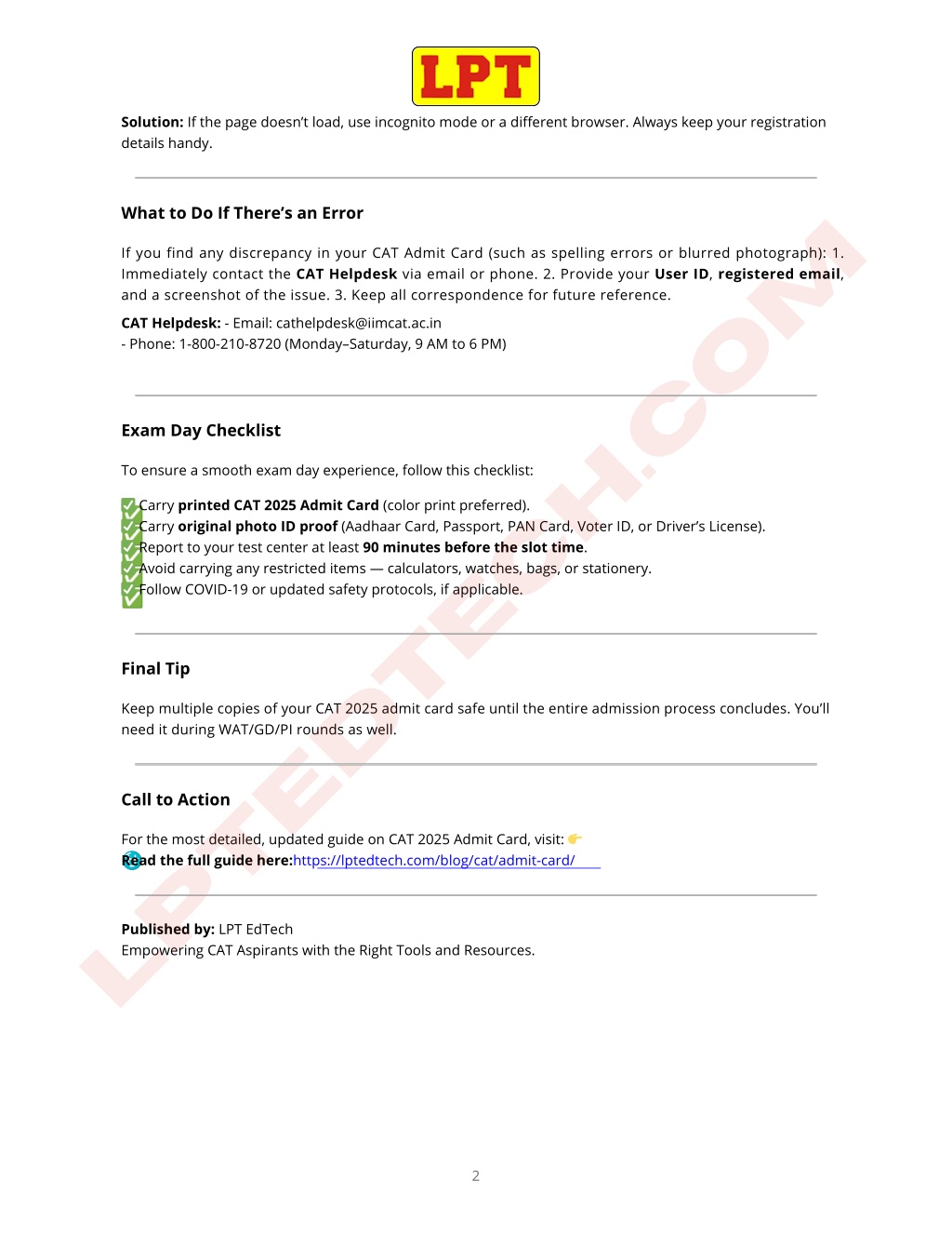 Solution: If the page doesn’t load, use incognito mode or a different browser. Always keep your registration details handy. What to Do If There’s an Error If you find any discrepancy in your CAT Admit Card (such as spelling errors or blurred photograph): 1. Immediately contact the CAT Helpdesk via email or phone. 2. Provide your User ID, registered email, and a screenshot of the issue. 3. Keep all correspondence for future reference. lptedtech.com CAT Helpdesk: - Email: cathelpdesk@iimcat.ac.in - Phone: 1-800-210-8720 (Monday–Saturday, 9 AM to 6 PM) Exam Day Checklist To ensure a smooth exam day experience, follow this checklist: ✅ Carry printed CAT 2025 Admit Card (color print preferred). ✅ Carry original photo ID proof (Aadhaar Card, Passport, PAN Card, Voter ID, or Driver’s License). ✅ Report to your test center at least 90 minutes before the slot time. ✅ Avoid carrying any restricted items — calculators, watches, bags, or stationery. ✅ Follow COVID-19 or updated safety protocols, if applicable. Final Tip Keep multiple copies of your CAT 2025 admit card safe until the entire admission process concludes. You’ll need it during WAT/GD/PI rounds as well. Call to Action For the most detailed, updated guide on CAT 2025 Admit Card, visit: ? Read the full guide here:https://lptedtech.com/blog/cat/admit-card/ Published by: LPT EdTech Empowering CAT Aspirants with the Right Tools and Resources. 2