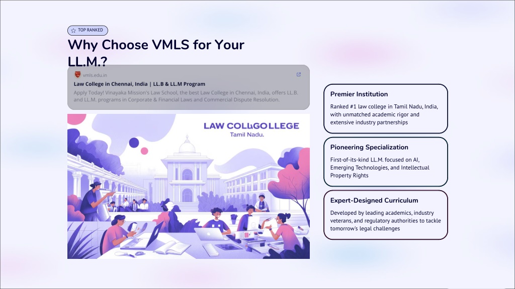 TOP RANKED Why Choose VMLS for Your LL.M.? Premier Institution Ranked #1 law college in Tamil Nadu, India, with unmatched academic rigor and extensive industry partnerships Pioneering Specialization First-of-its-kind LL.M. focused on AI, Emerging Technologies, and Intellectual Property Rights Expert-Designed Curriculum Developed by leading academics, industry veterans, and regulatory authorities to tackle tomorrow's legal challenges