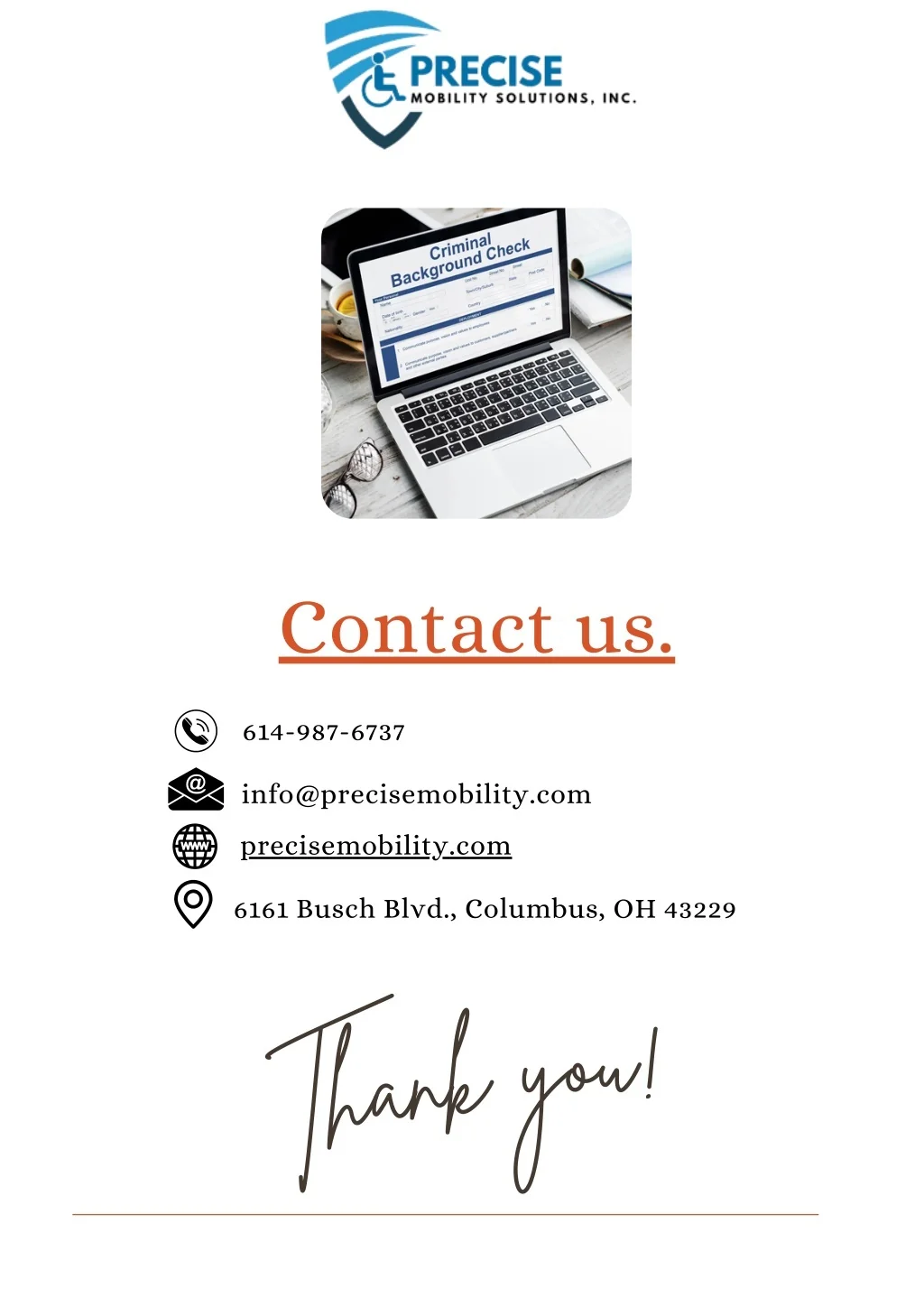 Contact us. 614-987-6737 info@precisemobility.com precisemobility.com 6161 Busch Blvd., Columbus, OH 43229 Thank you!