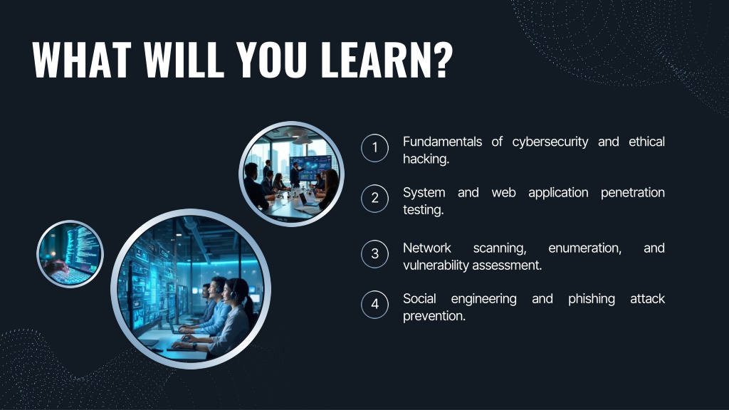 3. WHY CHOOSE ? • Enhances career opportunities in the growing cybersecurity field. • 1 • Provides hands-on training in real-world hacking techniques. • 2 • Equips learners to prevent, detect, and respond to cyber threats. • 3